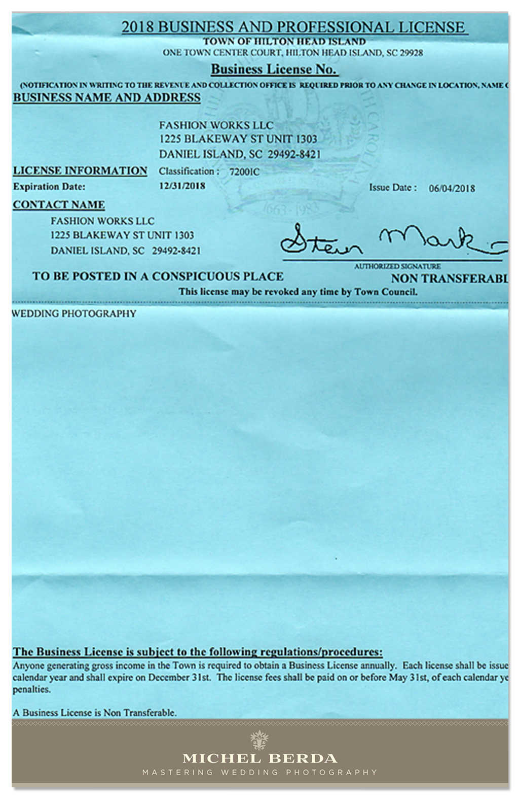 it’s important to ask if they are licensed and insured. Specifically, ask if they can provide proof of a State of South Carolina license, a license for the municipality in Charleston, and liability insurance that meets the requirements of the wedding venue. Many people assume that just because a photographer has a website and calls themselves a wedding professional, they are properly licensed. However, in Charleston and other municipalities in South Carolina, wedding photographers and vendors are required to have various business licenses. This includes licenses for the City of Charleston, the Town of Isle of Palms, the Town of Mount Pleasant, and Sullivan Island. It’s also possible that the wedding venue will require proof of liability insurance and a business license. Legitimate liability insurance can only be obtained by an actual business that is properly licensed. As a responsible photographer, I always provide proof of my licenses and liability insurance to clients and venues. In short, it’s important to ensure that your wedding photographer is properly licensed and insured to give you peace of mind on your special day.